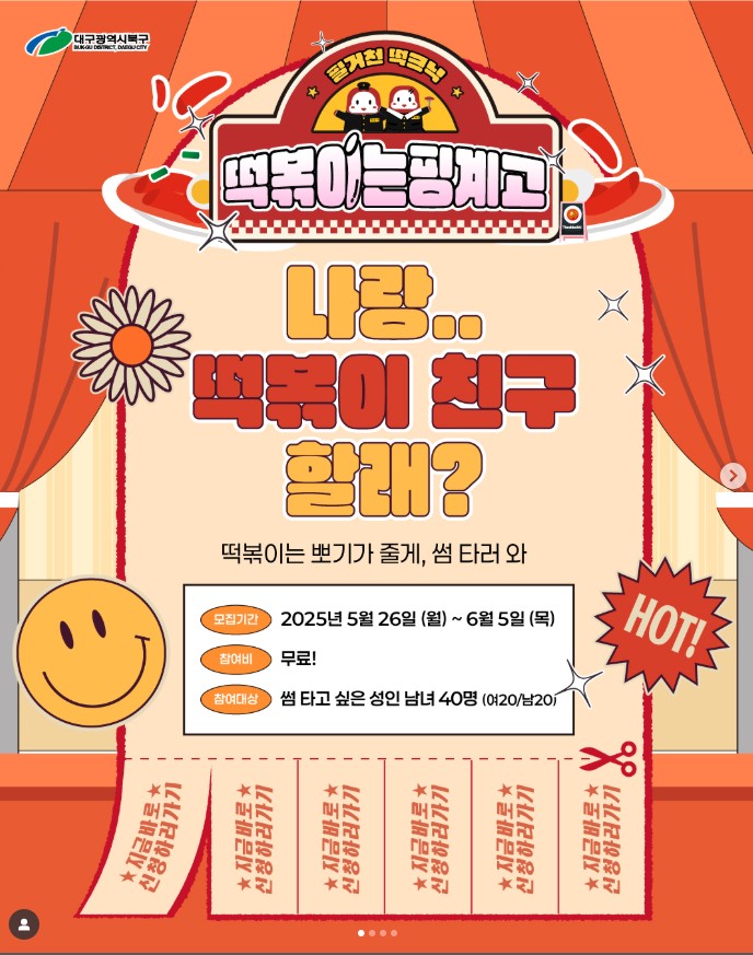 - 또는 대구 북구청(@buk_daegu) 인스타그램 통해 신청폼 확인 가능 - 선정안내: 6월 6일(금), 주최측에서 개별 연락 예정